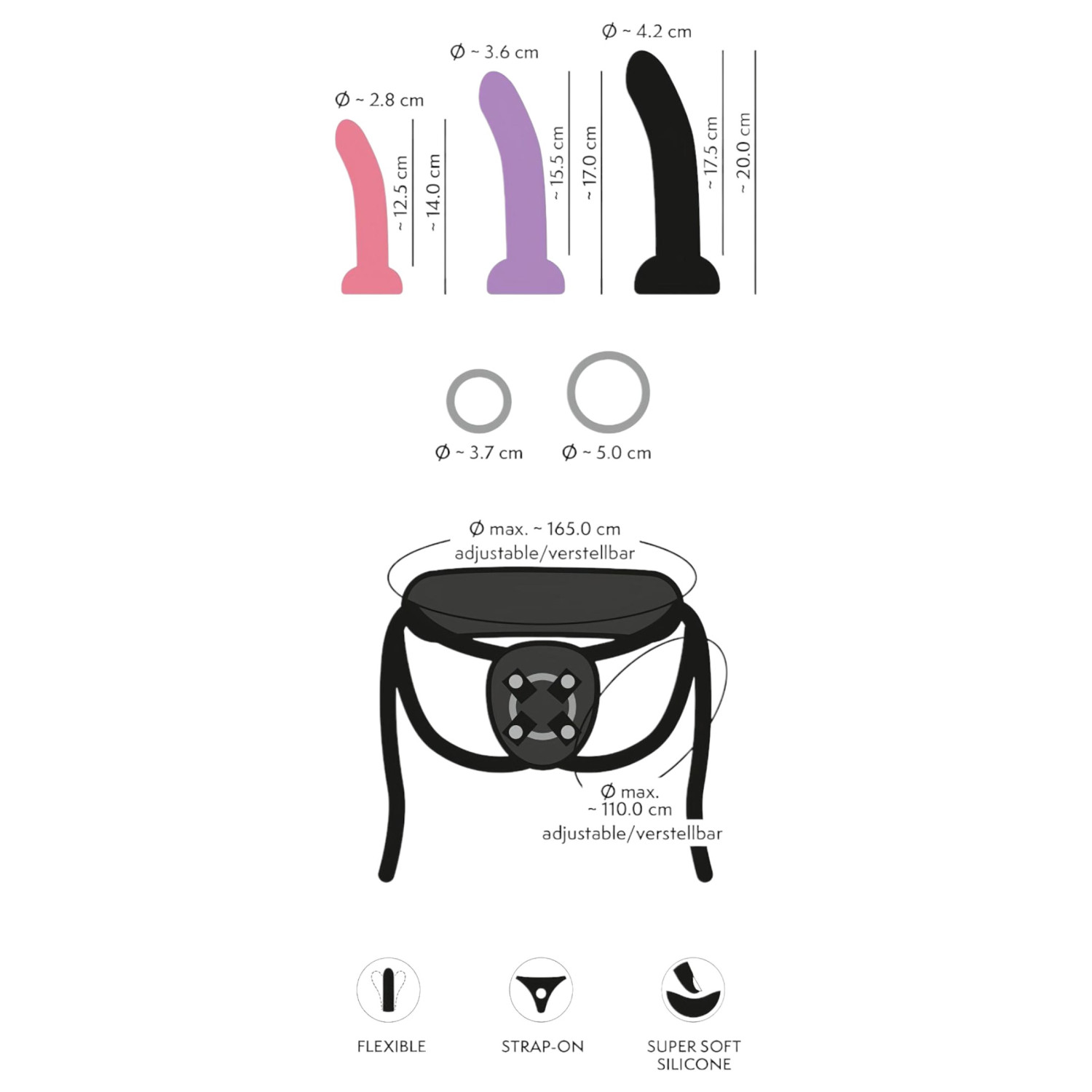 Αυτό το σετ με 4 κομμάτια περιλαμβάνει τρία εναλλάξιμα δονητές (S, M, L) και μια ρυθμιζόμενη ζώνη για άνετη και ευέλικτη χρήση.
